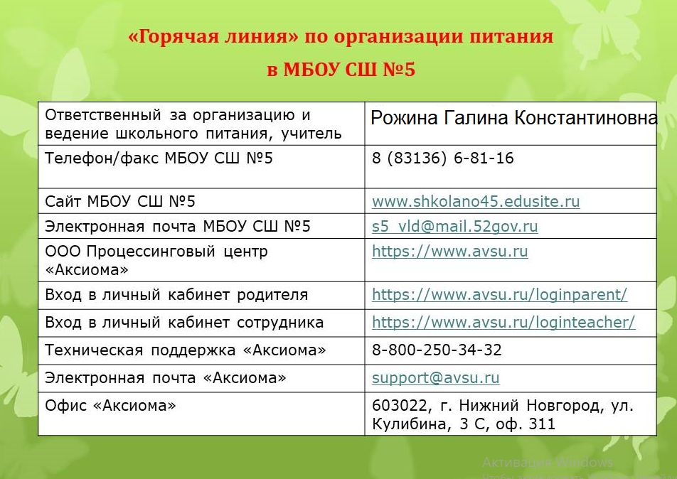 Оплатить школьное питание можно через Сбербанк, сайт (www.avsu.ru) в личном кабинете родителя и мобильное приложение "Аксиома", а также в терминалах оплата.ru. За более подробной информацией о регистрации в личном кабинете родителей и оплате за горячее питание родители могут позвонить по телефону 88002503432 с 3:00 до 20:00 МСК по будням.