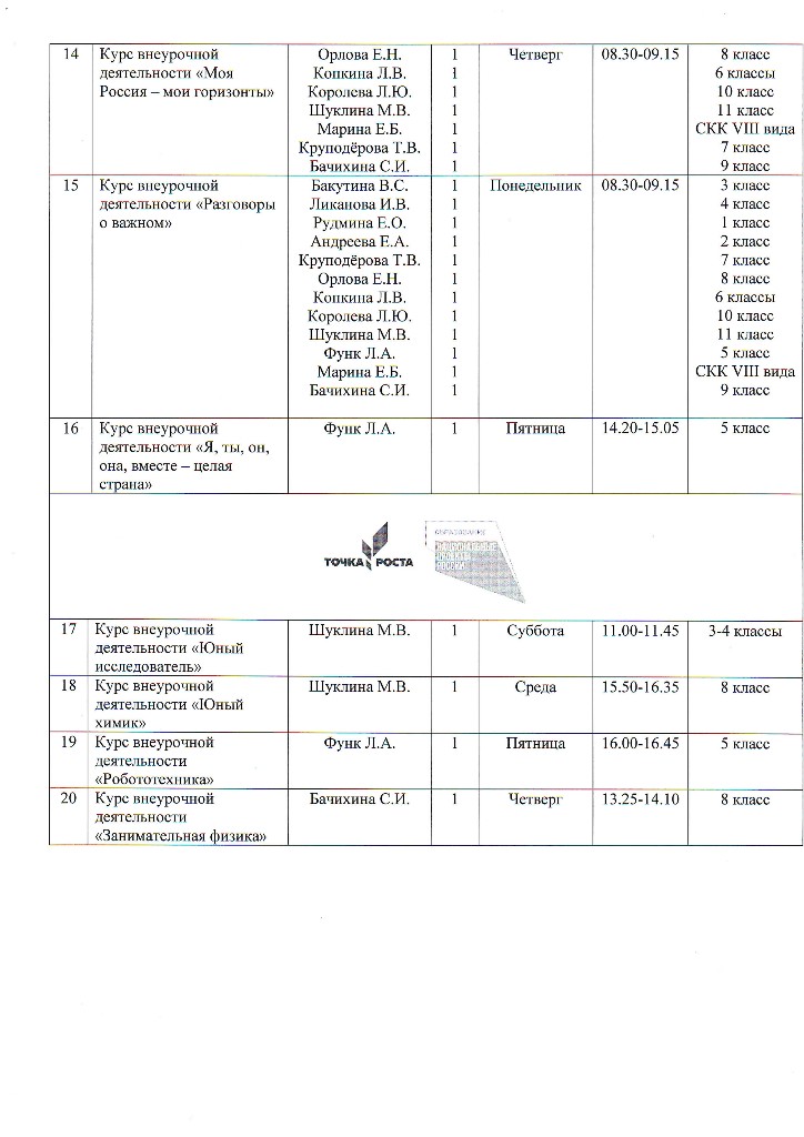 РАСПИСАНИЕ КУРСОВ ВНЕУРОЧНОЙ ДЕЯТЕЛЬНОСТИ