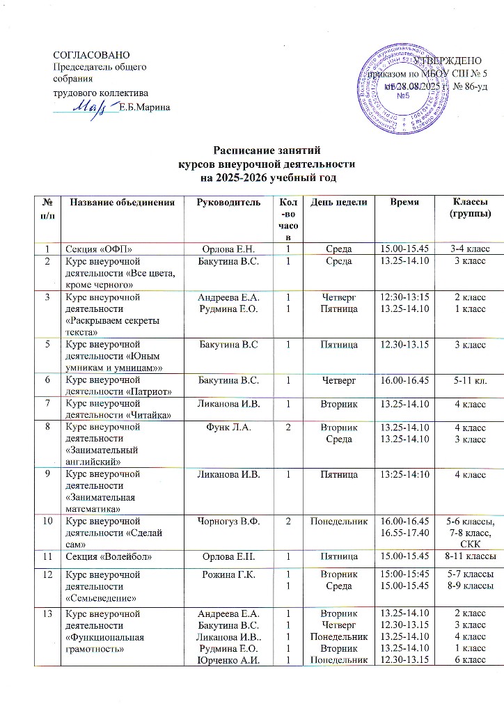 РАСПИСАНИЕ КУРСОВ ВНЕУРОЧНОЙ ДЕЯТЕЛЬНОСТИ НА 2025-2026 УЧЕБНЫЙ ГОД
